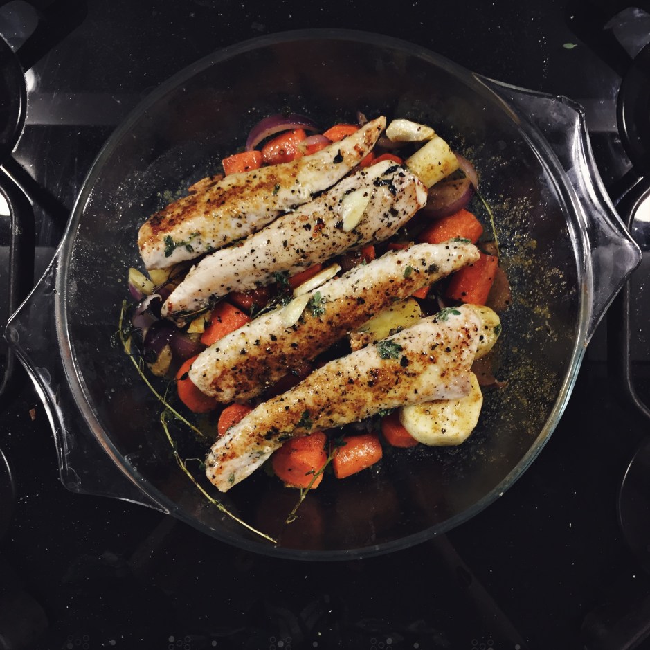 I have roasted the ingredients gradually and then braised all together in a heat resistant dish, to keep the meat and veg soft and tender.