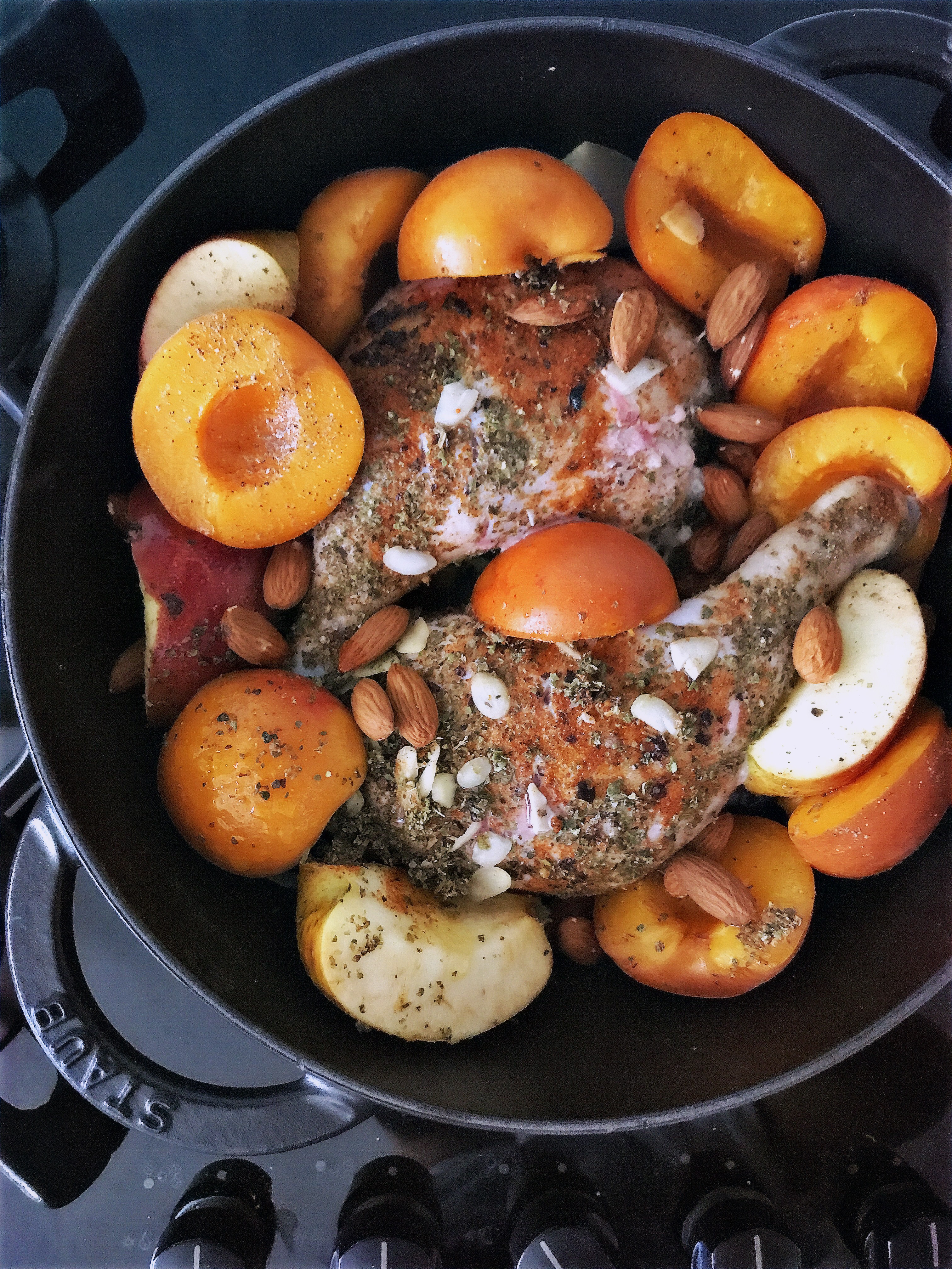 Here comes the solution; duck confit roasted with apricots, apples and almonds.