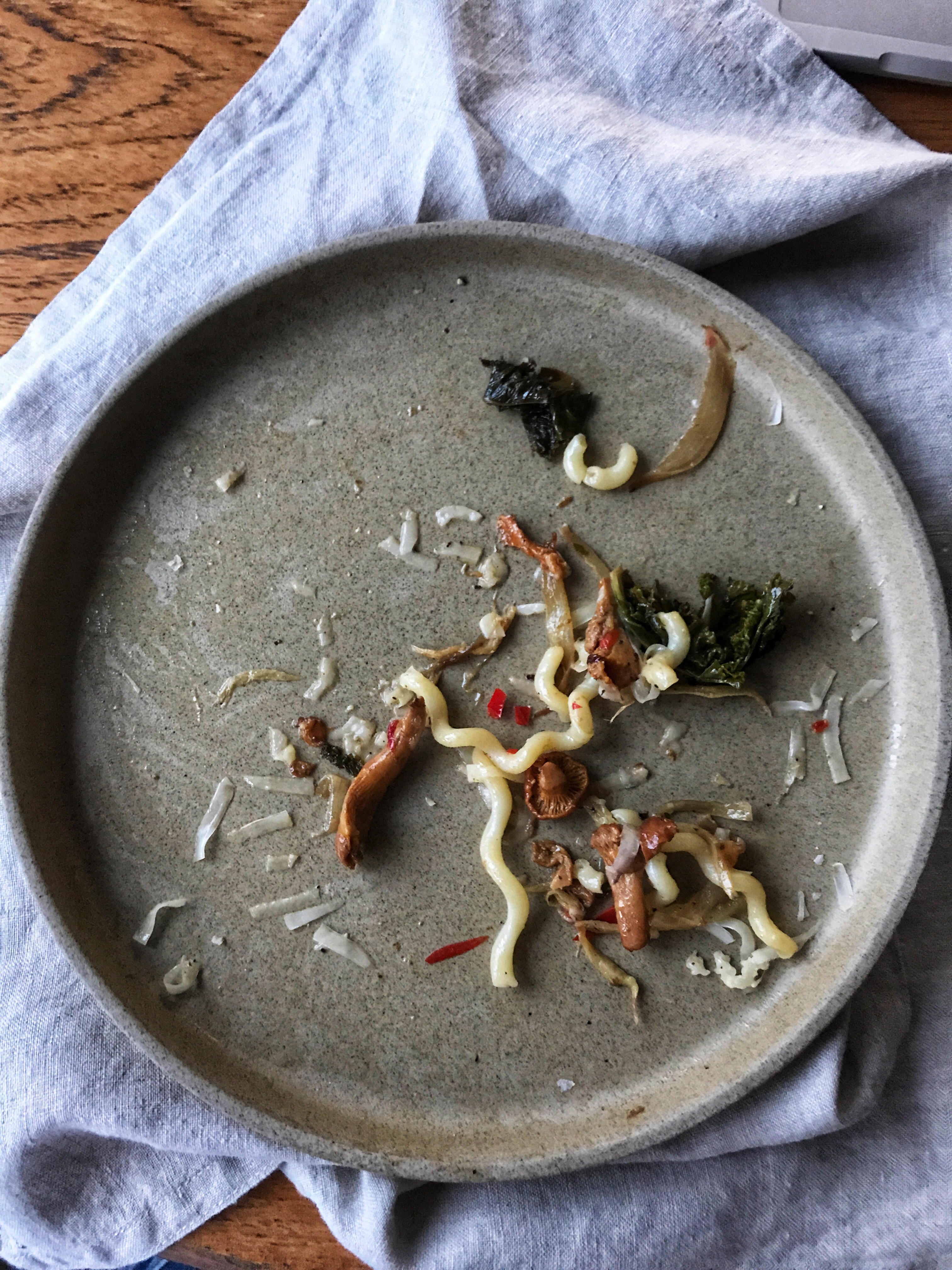 I have a vivid memories of my grandparents taking my brother and I for the weekend trips into the woods. I remember the Autumn ones especially because of the mushrooms about which most of my family was mad about. Well, let me tell you picking up a mushroom has nothing to do with picking up a wild berries or herbs. It takes a skill which to this day I seem to lack. So whilst my grandparents, supported by my helpful brother, were busy adding one mushroom after another into their baskets, I was just wondering what we’ll make out of them. Chanterelles in particular. Their characteristic, slightly spicy aftertaste, reminds me of autumn and of precious moments spent with family. As I couldn’t compete with my granddad’s mushroom creamy soup and my grans marinated fungi, I created this dish out of what was available in their garden: shallot onions, kale, garlic and pasta. Who would have thought that just a few ingredients could create such tasty meal?